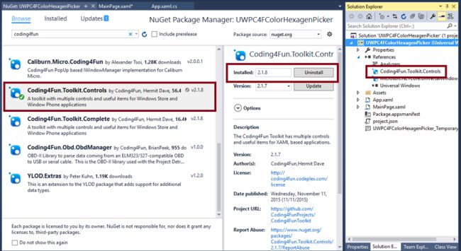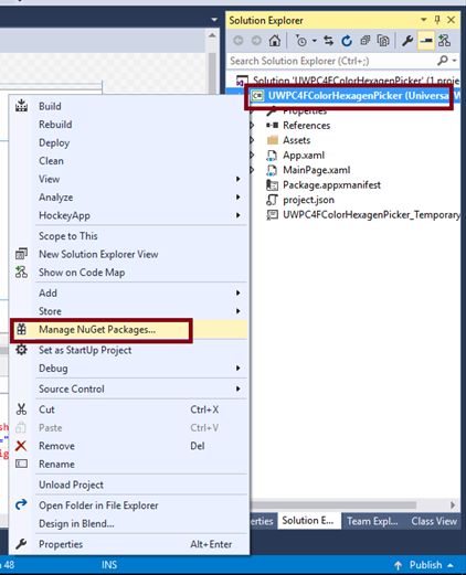 Reading this article, you can learn how to use Coding4Fun ColorHexagonPicker in Universal Windows Apps development with XAML and Visual C# also binds the ColorHexagonPicker selected Color to a Rectangle Filled property using ElementBinding.