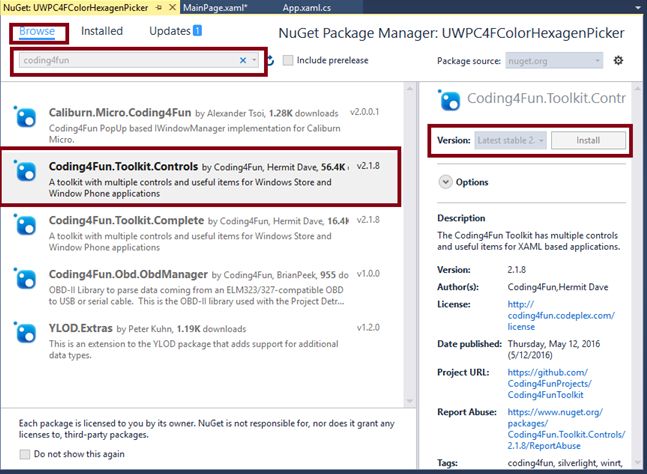 Choose Browse and Search Coding4Fun.Toolkit.Controls select the package and install it.