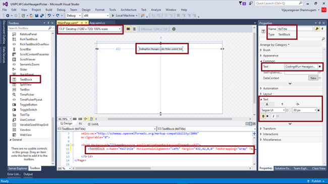 - <TextBlock x:Name="tblTitle" HorizontalAlignment="Left" Margin="432,42,0,0" TextWrapping="Wrap" Text="Coding4Fun Hexagon Color Picker control Test" VerticalAlignment="Top" FontSize="20" FontWeight="Bold" />
