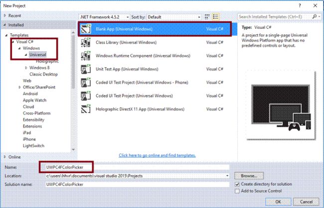 Open Visual Studio 2015 -> Start -> New Project-> select Universal (under Visual C#->Windows)-> Blank app -> give the suitable name for your app (UWPC4FColorPicker)->OK.