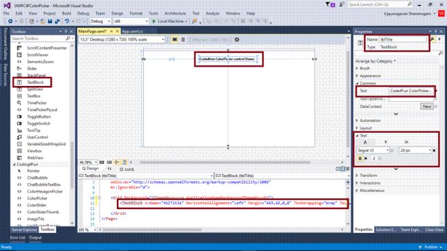 - <TextBlock x:Name="tblTitle" HorizontalAlignment="Left" Margin="419,42,0,0" TextWrapping="Wrap" Text="Code4Fun ColorPicker control Demo" VerticalAlignment="Top" Height="37" Width="427" FontSize="24" FontWeight="Bold" />