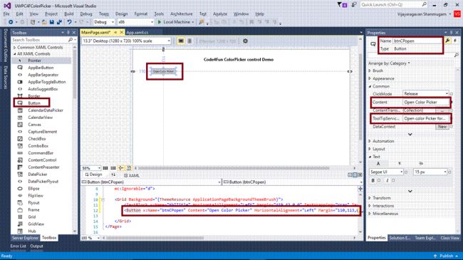 - <Button x:Name="btnCPopen" Content="Open Color Picker" HorizontalAlignment="Left" Margin="110,113,0,0" VerticalAlignment="Top" RenderTransformOrigin="-5.01,1.529" ToolTipService.ToolTip="Open color Picker for changing Background" Click="btnCPopen_Click" />