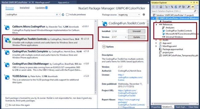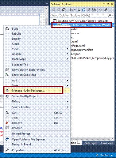 To add the reference, right click on your project (UWPC4FColorPicker) and select Manage NuGet Packages.