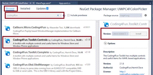 Choose browse and search Coding4Fun.Toolkit.Controls. Select the package and install it.