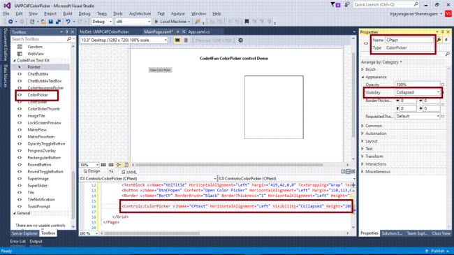 Now, add ColorPicker Control, set the name and Visibility property to hide the ColorPicker control.