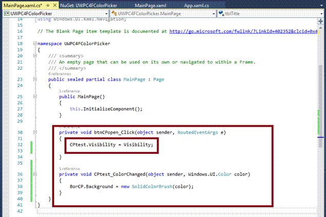 - <Controls:ColorPicker x:Name="CPtest" HorizontalAlignment="Left" Height="358" Margin="284,113,0,0" VerticalAlignment="Top" Width="374" ColorChanged="CPtest_ColorChanged" Visibility="Collapsed" /> </Grid>