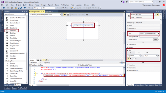 - <TextBlock x:Name="tblTitle" HorizontalAlignment="Left" Margin="145,52,0,0" TextWrapping="Wrap" Text="UWP Cognitive Services - Bing Autosuggest API" VerticalAlignment="Top" Height="32" Width="373" FontSize="16" FontWeight="Bold" />