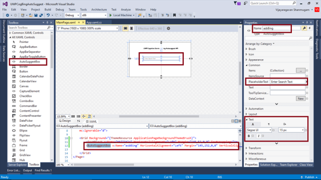 Add AutoSuggestBox control and set the Name, PlaceholderText and Text Properties