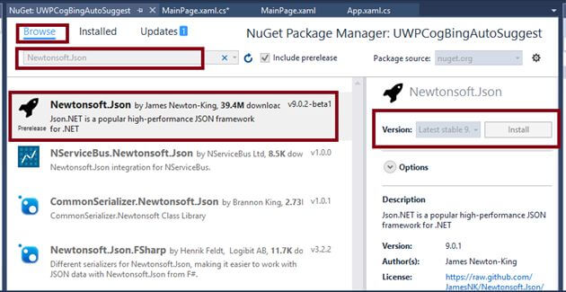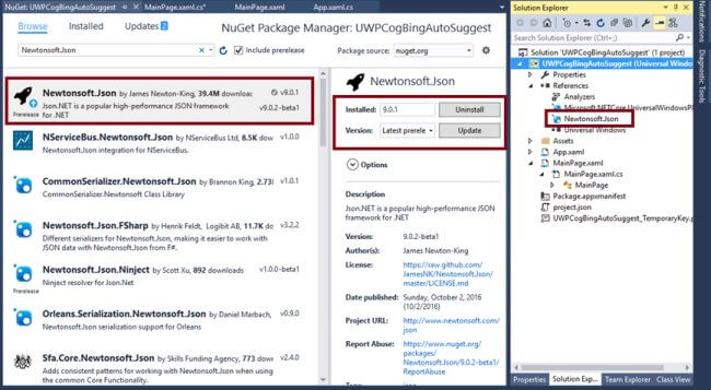 RightClick Your Project (UWPCogBingAutoSuggest) and Select Manage Nuget Packages.