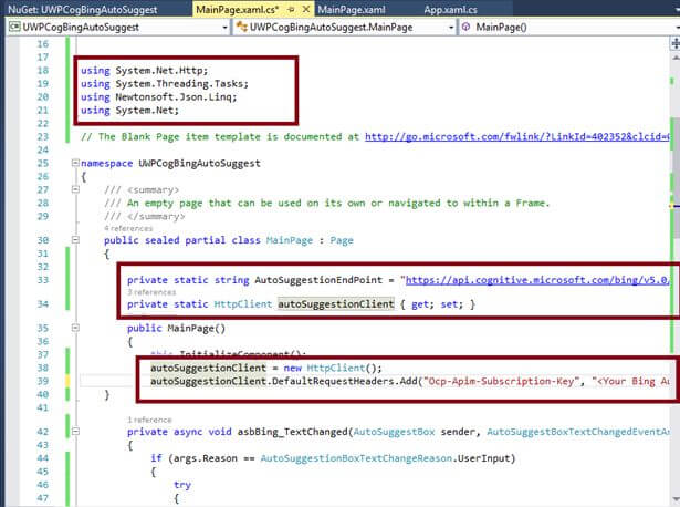 - autoSuggestionClient.DefaultRequestHeaders.Add("Ocp-Apim-Subscription-Key", "<Your Bing Auto suggest Key>");