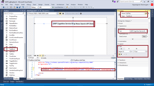 - <TextBlock x:Name="tblTitle" HorizontalAlignment="Left" Margin="163,43,0,0" TextWrapping="Wrap" Text="UWP Cognitive Service Bing News Search API Demo" VerticalAlignment="Top" Foreground="#FF2B2A2A" FontWeight="Bold" />