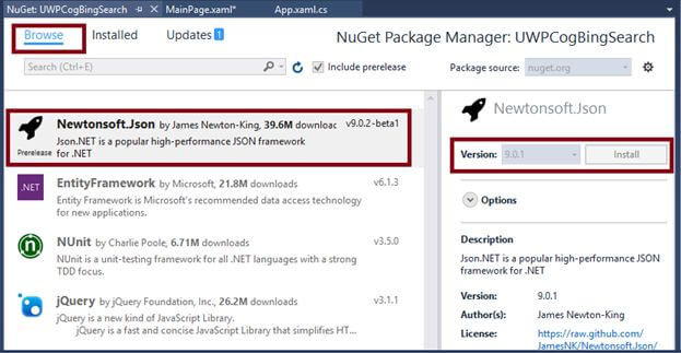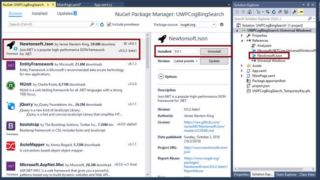 Open (double click) the file MainPage.xaml in the Solution Explorer and add the Newtonsoft.Json reference in the project. Right click your project (UWPCogBingSearch) and select "Manage NuGet Packages".