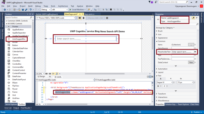 Add AutoSuggestBox control and set the Name, PlaceholderText, and Text Properties.