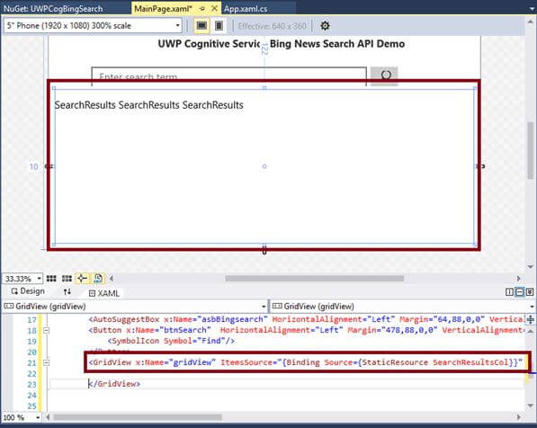 Add a GridView Control and set the ItemSource properties for displaying News Result,
