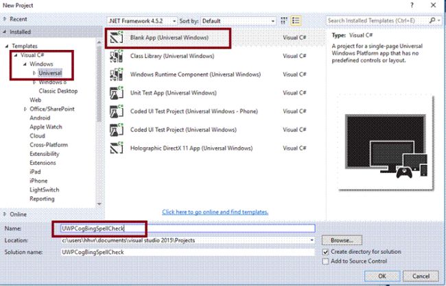Open Visual studio 2015 -> Start -> New Project-> Select Universal (under Visual C#->Windows)-> Blank app -> Give the suitable name for your app (UWPCogBingSpellCheck)->OK.