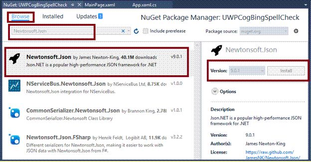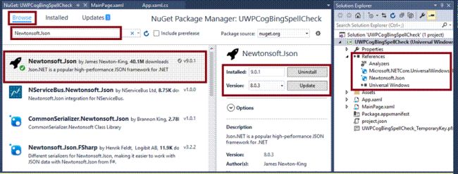 Open (double click) the file MainPage.xaml in Solution Explorer and add the Newtonsoft.Json reference in the project. Right click on your Project (UWPCogBingSpellCheck) and select Manage NuGet Packages.