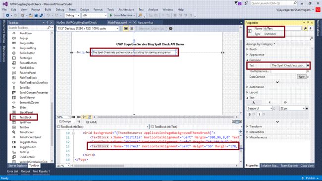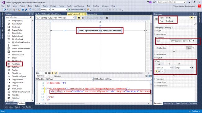 - <TextBlock x:Name="tblTitle" HorizontalAlignment="Left" Margin="380,96,0,0" TextWrapping="Wrap" Text="UWP Cognitive Service Bing Spell Check API Demo" VerticalAlignment="Top" FontWeight="Bold" FontSize="24" />