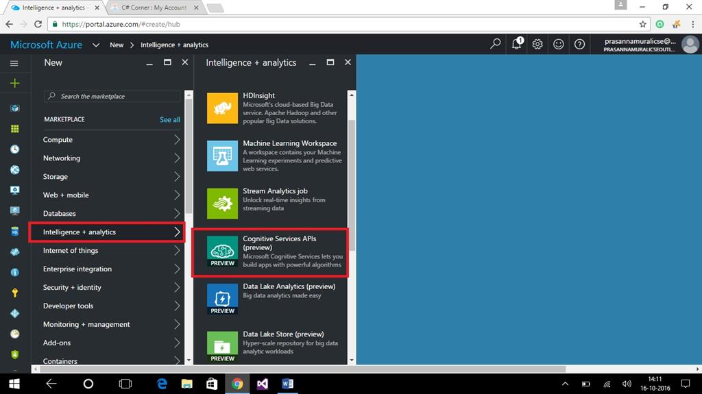 Once dashboard appears, now click + button, available in the left top corner and then select Intelligence + analytics. Select Cognitive Service API's form intelligence + analytics blade appears.