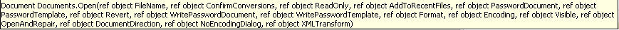 Finally, we can use the Documents collection property of the Application to open our RTF file. The Documents property has an Open method that takes about 20 parameters as shown in figure 3: