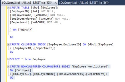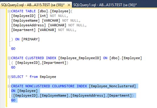 Overview In an organization data is considered as a primary key or part. Data is crucial for any organization. As data grows database size increases and its respective table size also increases. In a previous firm the main application of that firm's INET banking was in SQL database and was in SQL 2005, and as a result certain tables like customer details, account balance size increased day by day in GBs. To find a particular record from October searching a customer required lot of time and as a result server memory was increasing and it was a painful task to search a record in that particular table because already data was huge and to find a record was a pain. Due to this they needed to do purging activity on quarterly basis (i.e. after 3 months) they take data which is required from date to date and the rest of the data is moved into a different server. As these are some of the drawbacks of SQL Server 2005 and so on till SQL Server 2008. Since SQL server 2012 they have introduced column store index. As the term clearly tells you data is stored in column wise format. So let’s see what column store index is about. Introduction In SQL Server everyone is aware that queries which we type in query window results or output are displayed in grid view format. Technically, SQL server stores data logically in terms of rows and columns that are stored in disks in row store format inside data pages. Now here data pages are nothing but a table in which your data i.e. rows and columns are stored in a single data page. As in SQL Server indexes (clustered index or non-clustered index) data is stored in row wise format or structure. Column Store index stores data in a columnar format. Row Wise Structure, “PAGE N" As a diagram here the data is stored in columnar format. As you can see I have given that column as PAGE N if there are n rows and columns now imagine for a search condition the time required and I/O request for the hardware as well. Now let’s see a column store index how it is stored. Just compare two figure and you will be able to see the difference in columnstore index; each column has its representative Pages. As a result the query tuning, indexing or you can say search condition becomes easier the resultant outtime is less as compared to previous figure. Lets start by practically comparing how much I/O time more in these two by creation table and indexes . Lets Start