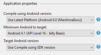 - Check for the “Compile using Android version:” value. Also note that the “Target Android version” can be selected as the “Use Compile using SDK version” to make things a bit simpler.