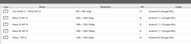 Figure 4: Android emulators shown in Android Studio AVD manager.