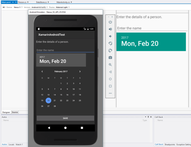 Figure 5: Android Studio emulator with Android 7.0 running a Xamarin application targeting Android 6.0 application.