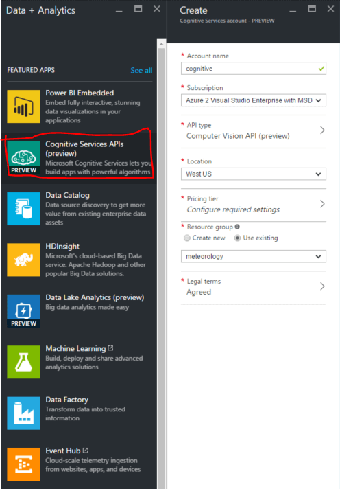 Select Data + Analytics, then Cognitive Services APIs (Preview), then supply details for the Cognitive service.