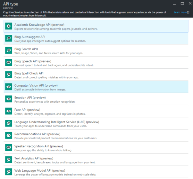 Microsoft Cognitive Services API offers a wide range of APIs and algorithms around which you can build your applications. The algorithms include facial recognition, speech API, Computer Vision, spelling app, Emotion API, Video API, Linguistics API etc. The APIs are based on five main categories, vision, speech, search, language, and knowledge.