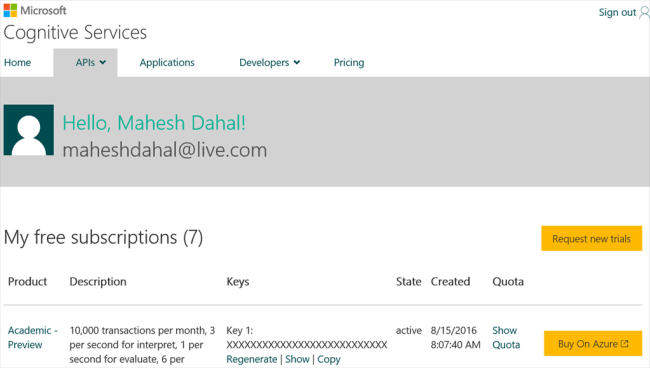 Once you click Create, just wait for a few minutes and your Cognitive service will be ready to serve your application. After the service is ready, you have to go to https://www.microsoft.com/cognitive-services and click on My Account.