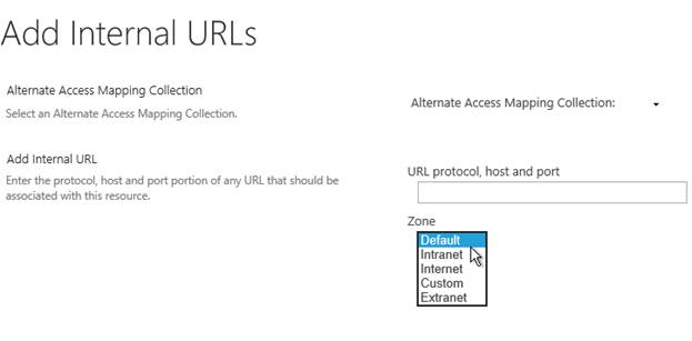 Provide a link as default, Intranet, Internet, Custom, or Extranet and map it as a internal URL to the web application.