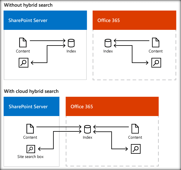 Cloud hybrid search facilitates the users to search for content, which exists in SharePoint 2016 On Premise Server along with the content search in Office 365. This is done by crawling the content in SharePoint 2016 Server and indexing it along with the search index in Office 365.