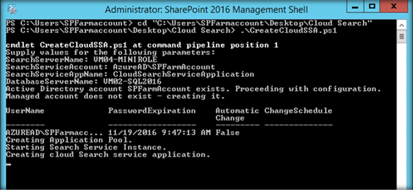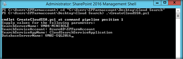 In order to create the Cloud Search Service Application, ensure that you have downloaded the script CreateCloudSSA.ps1 from here. Once you have the script downloaded to the Server, spin up SharePoint 2016 Management Shell as an administrator.