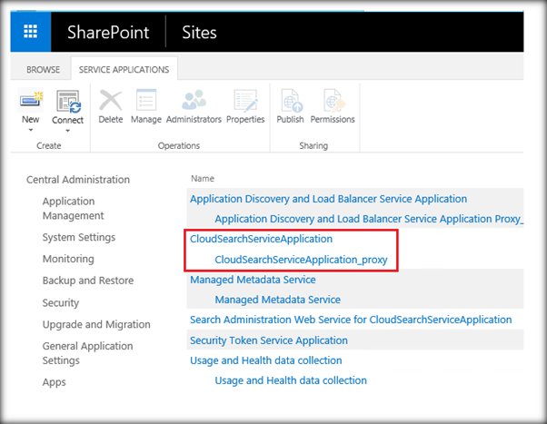 Now, if we go to the list of Service Application page, we can see the newly created Cloud search Service Application.