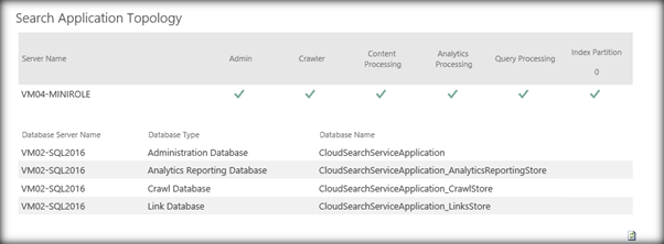 The Cloud search topology will be listed down in the same page. VM04-MINIROLE is the Server, where search has been configured and the various search Service components are activated. It will also add 4 databases in the SharePoint Database Server (VM02-SQL2016) as part of the Search Service Application creation.