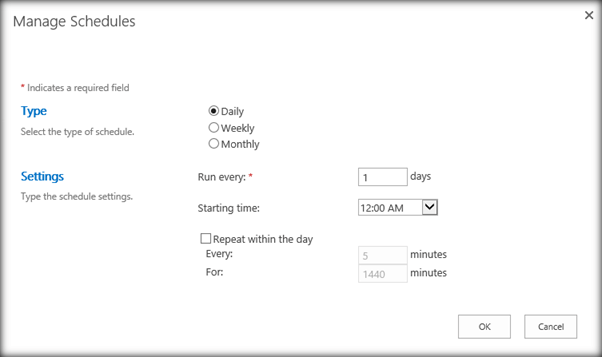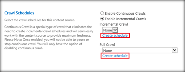 We can also specify the crawl schedules. We can set the schedules when the incremental and full crawls will take place in the Server.