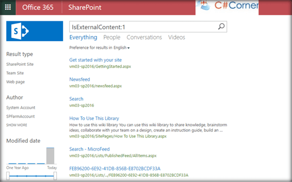 Once the crawl has completed, let's test the hybrid search scenario by going to SharePoint Online and search for IsExternalContent:1 .