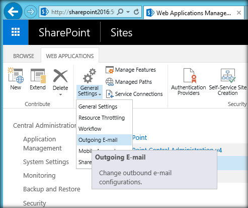 Select the web application where outgoing email settings have to be set. From General Settings, select Outgoing email.