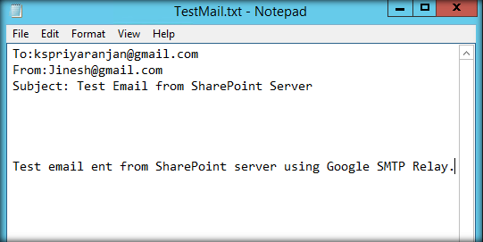 We can do a quick test of the outgoing email by creating a dummy email text file and placing it in the Pick Up folder. In order to do this, create a text file, as shown below.