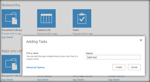 We can, now, test the Outgoing Email functionality from SharePoint. In order to test this out, let's create a Task List.