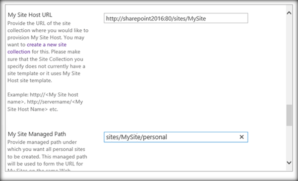 As we move down, we have the option to enter My Site Host URL. Enter the site URL, which was earlier created to act as My Site. We also have to specify the managed path under which My Sites will be created. Here, I have added the managed path “sites/MySite/Personal”.