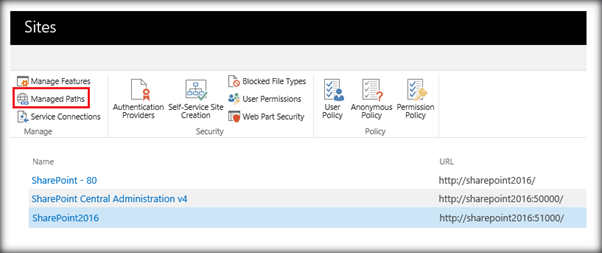Now, we have to create My Site managed path, which we had mentioned during the user profile Service Application creation. Select 'Managed Paths' from the managed Web Applications page.