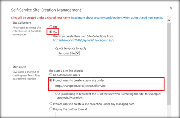 Set ‘On’ option to enable the creation of the Self-Service site creation feature. This will enable the users to create the sites on their own without the help of the site administrator. Now, we have to specify the path under which the site collections will be created. Here, I have mentioned the managed path ‘sites/SelfService’.