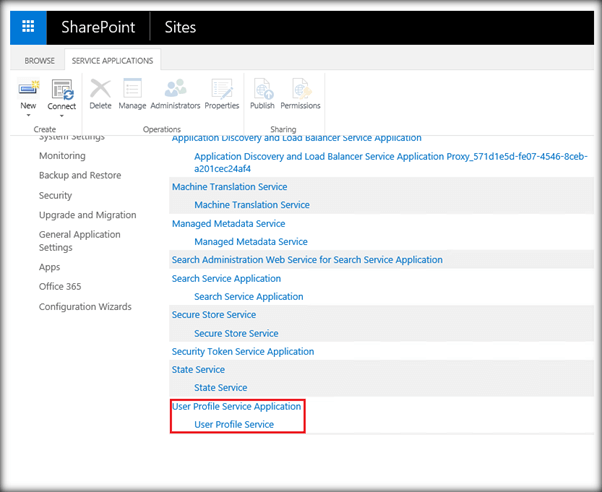 Now, let’s start with the user profile Service Application creation. Select ‘Manage Service Applications’ from Service Applications tab.