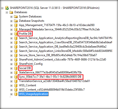If we check SQL Server, we can see the newly created databases, which were created along with the user profile Service Application.