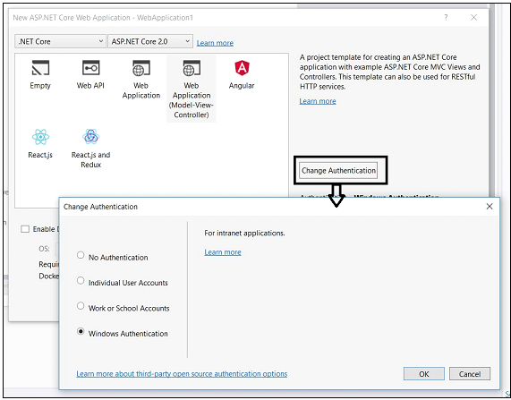 Alternatively, we can create applications that support windows authentication by using command line. Using following command, we can create asp.net MVC core application with windows authentication.