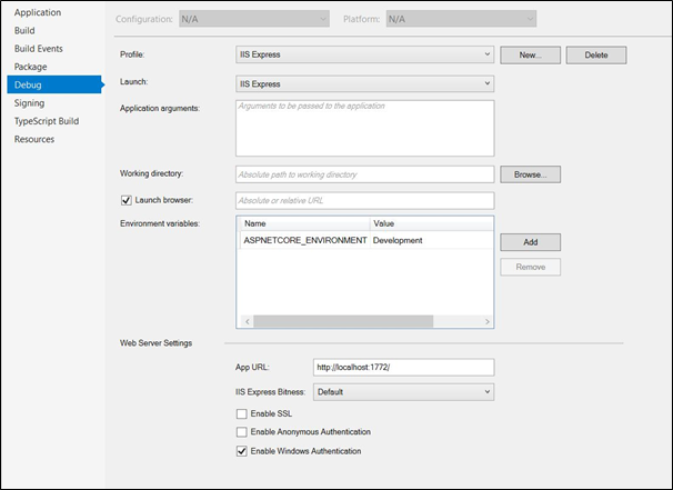 We can also configure the existing application for Windows Authentication by selecting the option of WA. To configure the authentication manually, open Visual Studio project properties >> go to Debug tab. It has the option to configure the same.