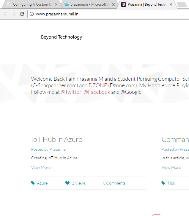 In this article, we will see about configuring the custom domain name in Azure App Service (Purchased directly from GoDaddy). Thanks for reading this article.