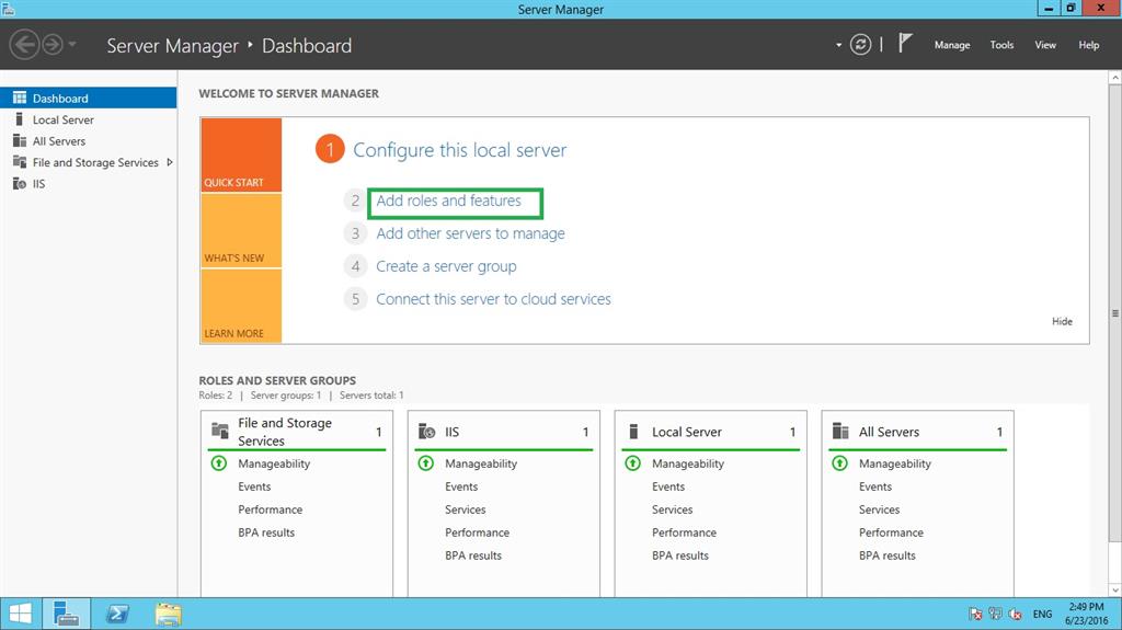 Step 2: In the Server manager, select an option “Add roles and features”.