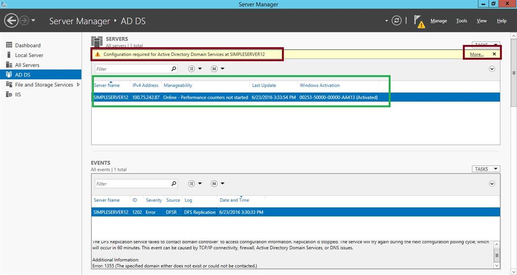 Step 12: In the dashboard, click AD DS. Once you have opened it, it shows some warning message as “Configuration Required for Active Directory Domain Service at SimpleServer12” and click More option.